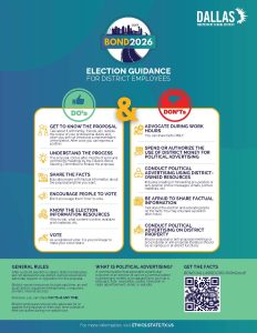 Texas election laws prohibit Dallas ISD staff from using public resources for electioneering or political advertising. Advocating for or against the bond on district time, property or using district resources, such as email, is strictly prohibited. Please take a moment to familiarize yourself with this guidance regarding the 2026 bond election.