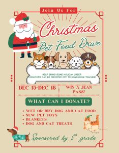The fifth grade is sponsoring a Christmas Pet Food Drive. Toy drives and food drives during this season are common, but those for pets are usual, so the school decided to spread the joy to animal adoption centers.